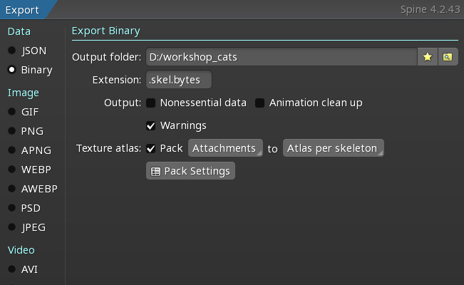 Spine binary export dialog