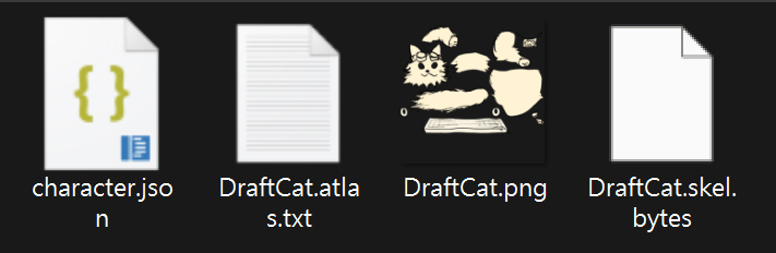 .skel.bytes,.atlas.txt, and.png. Place them in a new folder. - Create a