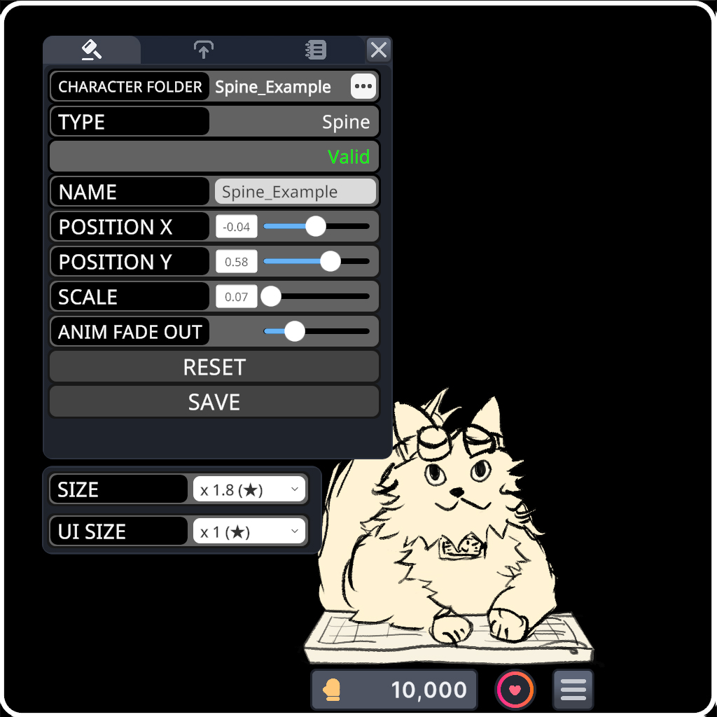 character.jsonfile. - Adjust Position X/Y, Scale, and Animation Fade Out to fine-tune the character.