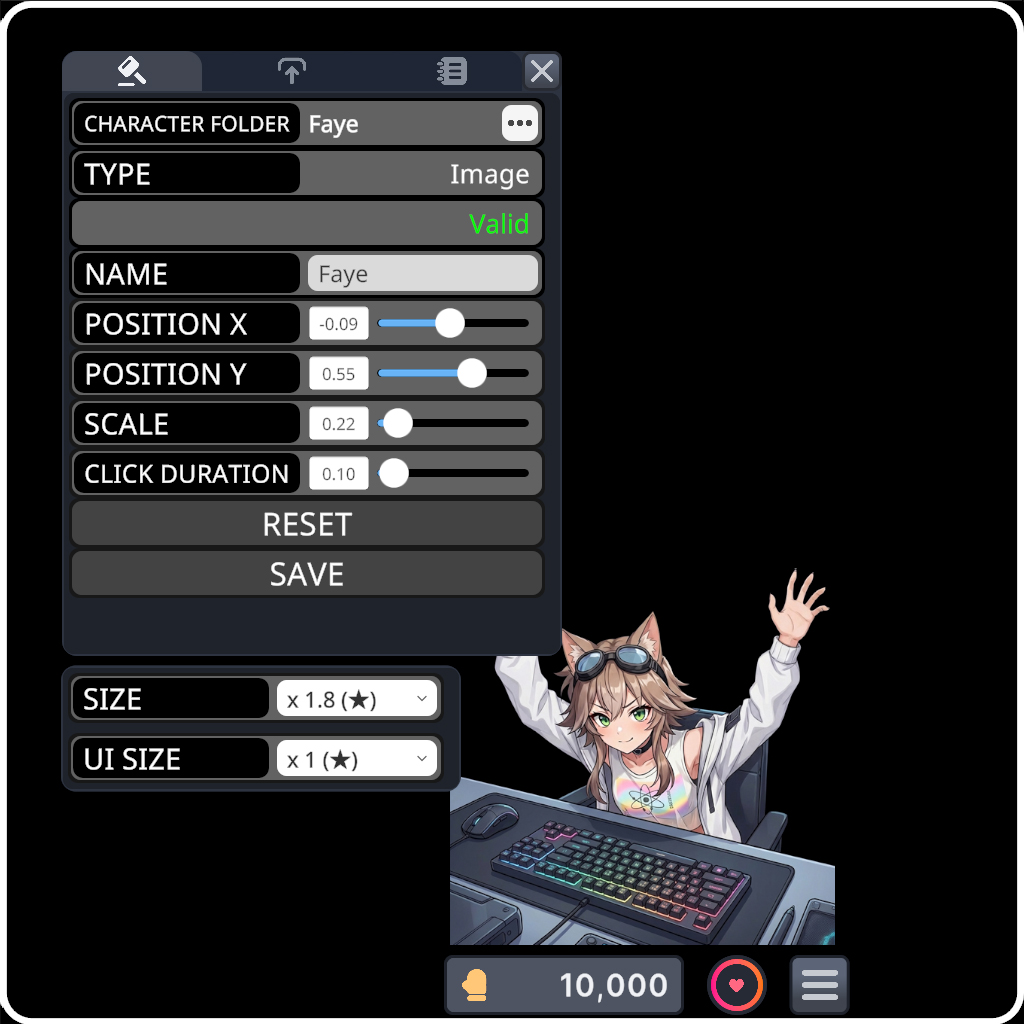 character.json. - Adjust Position, Scale, and Click Duration to fine-tune the character display.