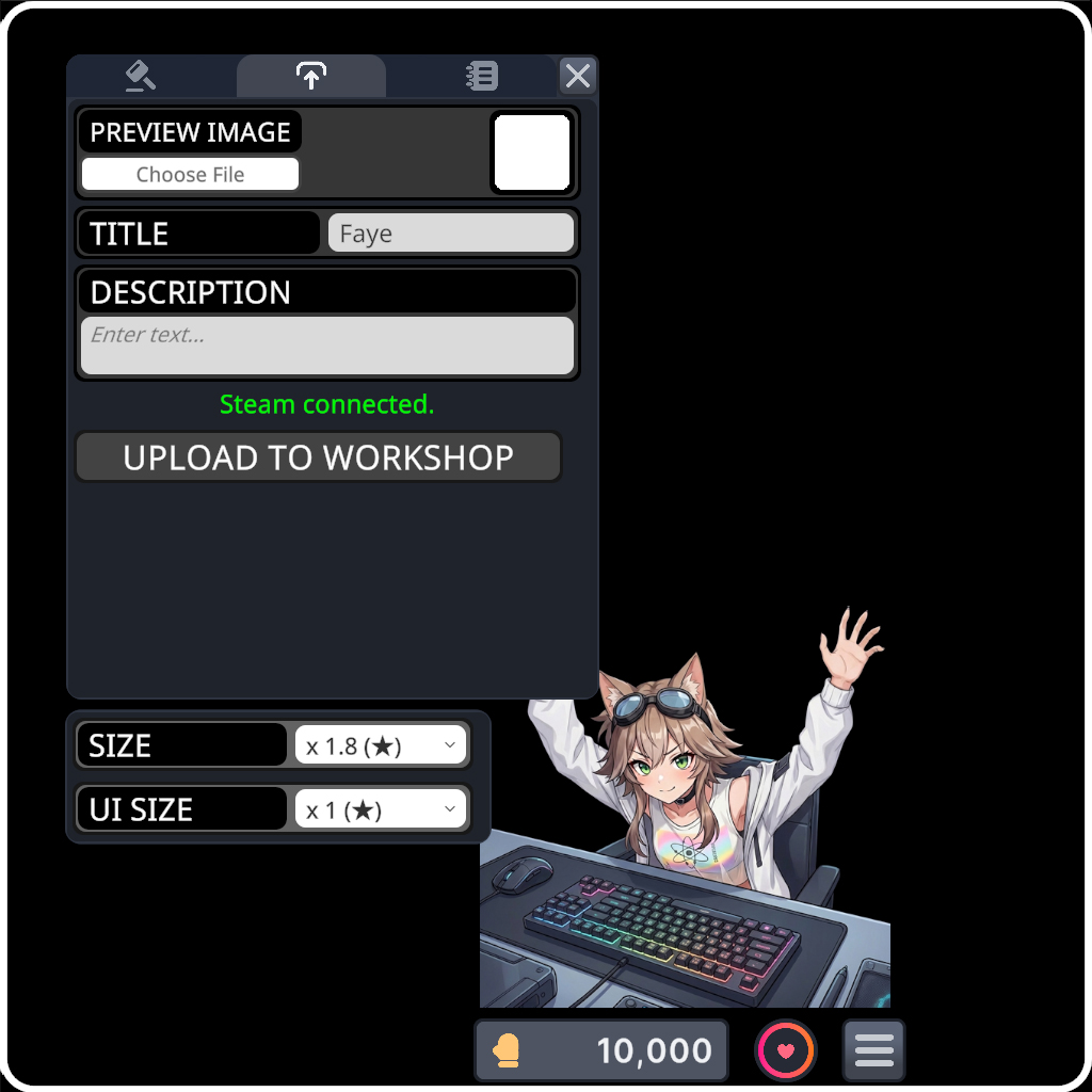 The Workshop Editor is a built-in tool that lets you create and upload custom cat characters to the Steam Workshop. Once uploaded, other players can subscribe to your character and it will appear in their character selector dropdown.