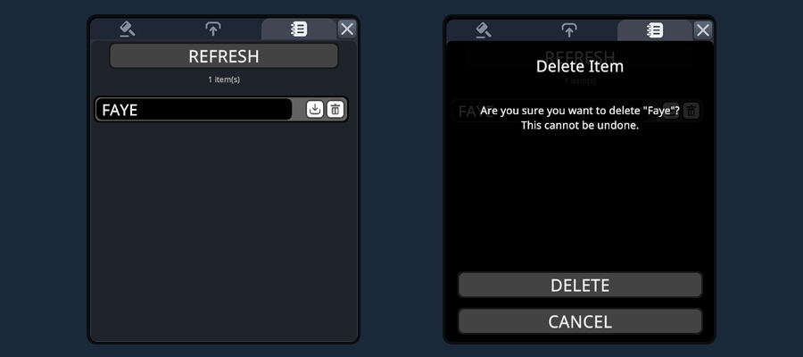 - Delete: Shows a confirmation dialog. Deletion is permanent and removes the item from the Workshop.